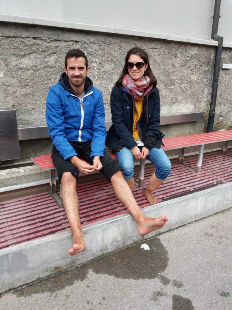 Walking north, we saw some striking hotels and came across small public areas to soak our feet in the Baden waters: an open-air bath and a bench, where Tom and I tried soaking our feet.