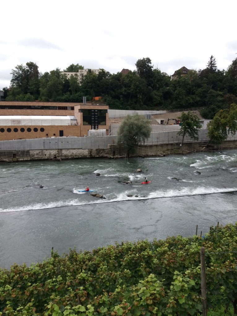 Continuing on our way, we saw from the opposite shore the thermal baths being built by architect Mario Botta. We were not happy with the building, and instead of stopping to contemplate it, we noticed some kayakers paddling in a fast, rocky area of the river. Waving to them, we left the city behind.