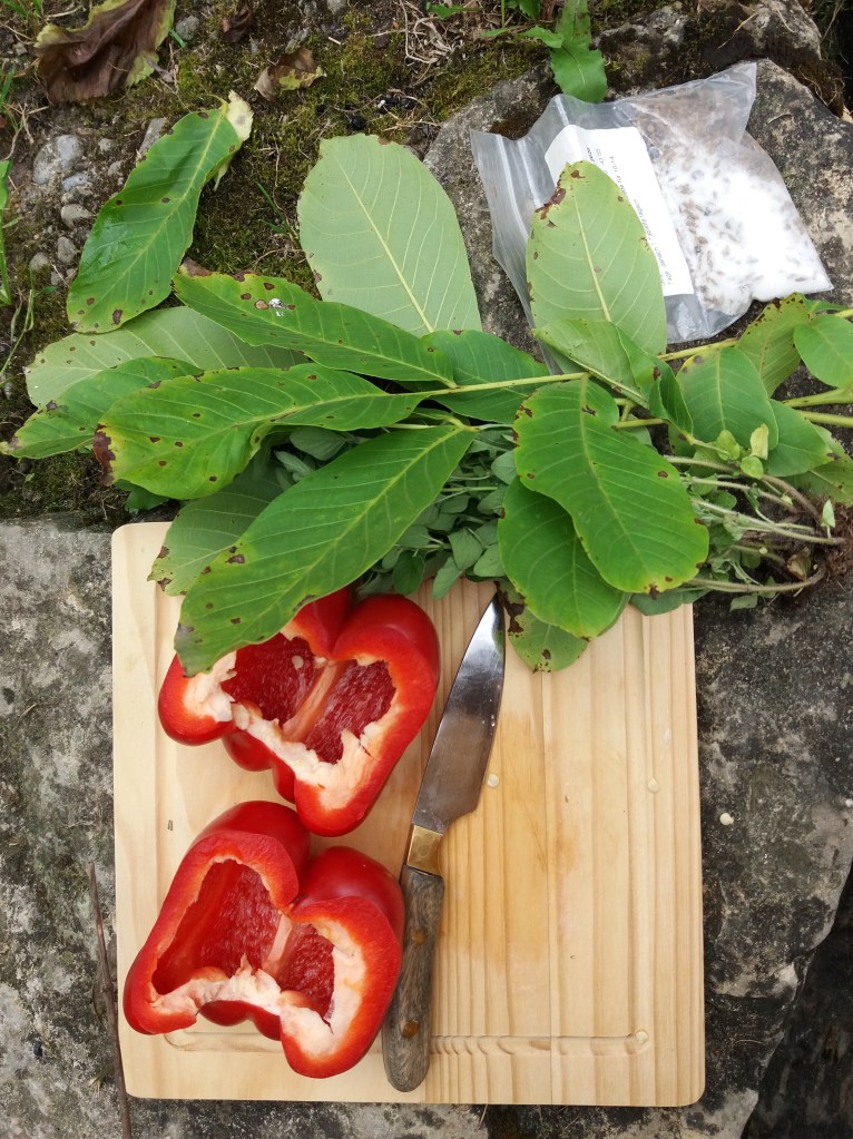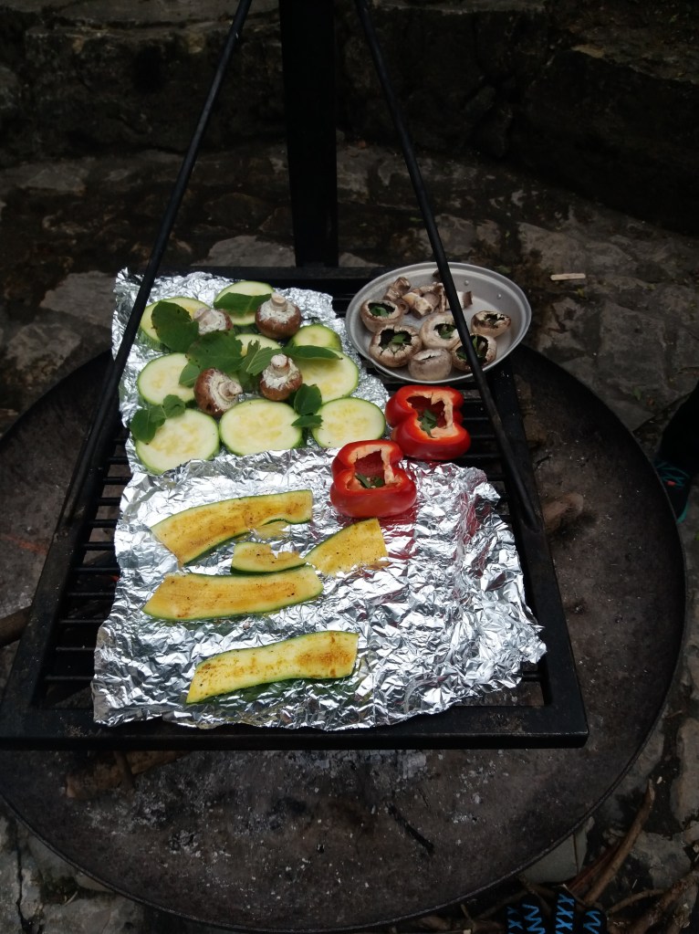 Cuando encontramos una zona donde era posible hacer fuego, nos detuvimos para cocinar y comer juntos. Juntamos leña en los alrededores y los colocamos en una parrilla. Cuando el fuego estuvo encendido, cada uno puso lo que había llevado: papas, pimientos, zapallos, champignones y queso. Disfrutamos de un momento de descanso al lado del fuego y de un sabroso almuerzo, el cual condimentamos con orégano y nogal que recogimos en la zona gracias al consejo de Paloma.