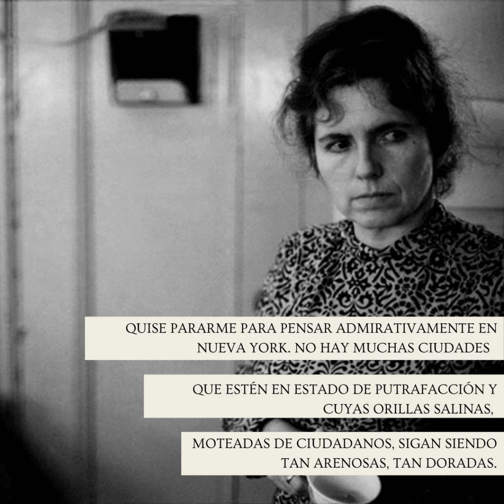 «Veo la plaza tal y como es –negra, morena, joven; abarrotada de vagabundos, yonquis y guitarristas terribles– y me siento tal y como soy, siento la ciudad tal y como es. He vivido mis conflictos, no mis fantasías, hasta el final, y Nueva York también. En eso estamos de acuerdo.»
