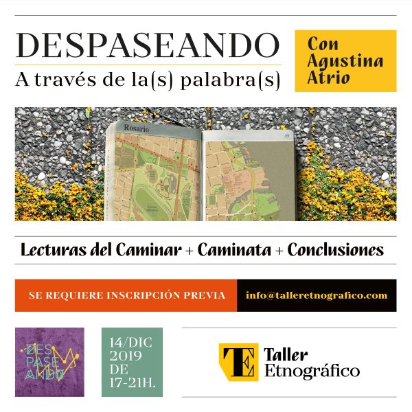 Taller Etnográfico junto a Despaseando les invita a caminar en la ciudad de Rosario el próximo sábado 14 de diciembre de 17 a 21 horas. Realizaremos una caminata a través de breves fragmentos de una serie de libros escritos por mujeres, describiendo escenas cotidianas y travesías públicas en la ciudad. Realizaremos una creación colectiva a través de las palabras y nuestros... Leer más →